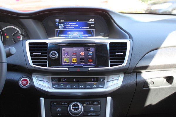 The Accord’s infotainment system has one of the most unique layouts on the market. Instead of giving users one large display from which they can control their music and navigation systems, Honda gives you two. The first, a beautiful 8-inch 800 x 480 VGA screen dubbed the “intelligent” Multi-Information Display (i-MID) sits at the top of the center stack and is used solely to display information such as track listings, directions, phone numbers and system settings. Below the 8-inch display is a smaller 6-inch touchscreen used to control the Accord’s audio system.