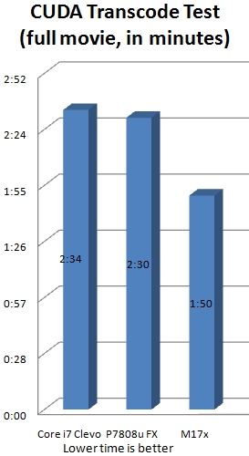 NVIDIA's CUDA technology can be used in applications like vReveal and Badaboom to offload some of the CPU's tasks onto the GPU for increased performance, and typically this is best when you want to multi-task, say, while zipping a file and transcoding a video. We transcoded the aforementioned 114MB file again using vReveal, and our Core i7 notebook finished in 2 minutes and 30 seconds while the older Gateway P7808u FX system took 2 minutes and 41 seconds. Both speeds were comparable given the similar enthusiast GPUs in each system.