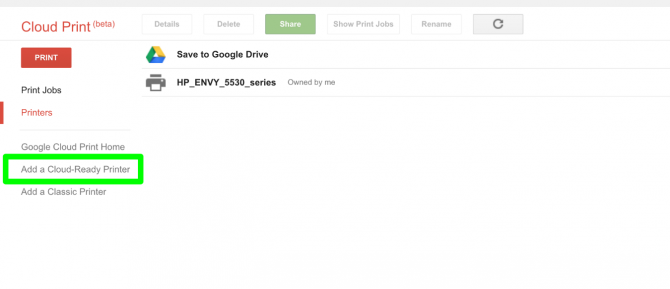 2. Select Add a Cloud Ready Printer from the menu on the left side. This will take you to a Google Print page with instructions for cloud-enabled printers built by Canon, Dell, Epson, HP and Kodak.