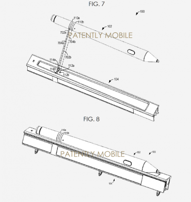 Schematic drawings from the filing show a stylus with an on/off button, indicator light and a charging terminal near its base. The patent reveals that the charging element would be magnetic, and allow the stylus to charge while lying flat against the dock.