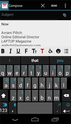 Don't want to break up your rhythm by hitting the space bar between words? SwiftKey 4 has a feature called "flow through space." Indeed, when we typed "cansomeonepleaseblogthisnow" into an email, Swiftkey suggested "can someone please blog this now" as a choice. However, once we exceeded six words, the app stopped offering suggestions of any kind.