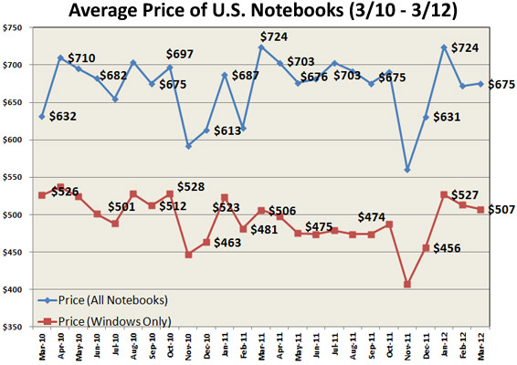The incredible stability in PC notebook prices, both month-over-month and year-over-year, shows that the industry has not yet been successful in getting consumers to buy higher-margin products like Ultrabooks. However, with a slew of Ivy Bridge notebooks due out later this spring and Windows 8 notebooks expected to arrive this fall, shoppers may be attracted to higher end products.