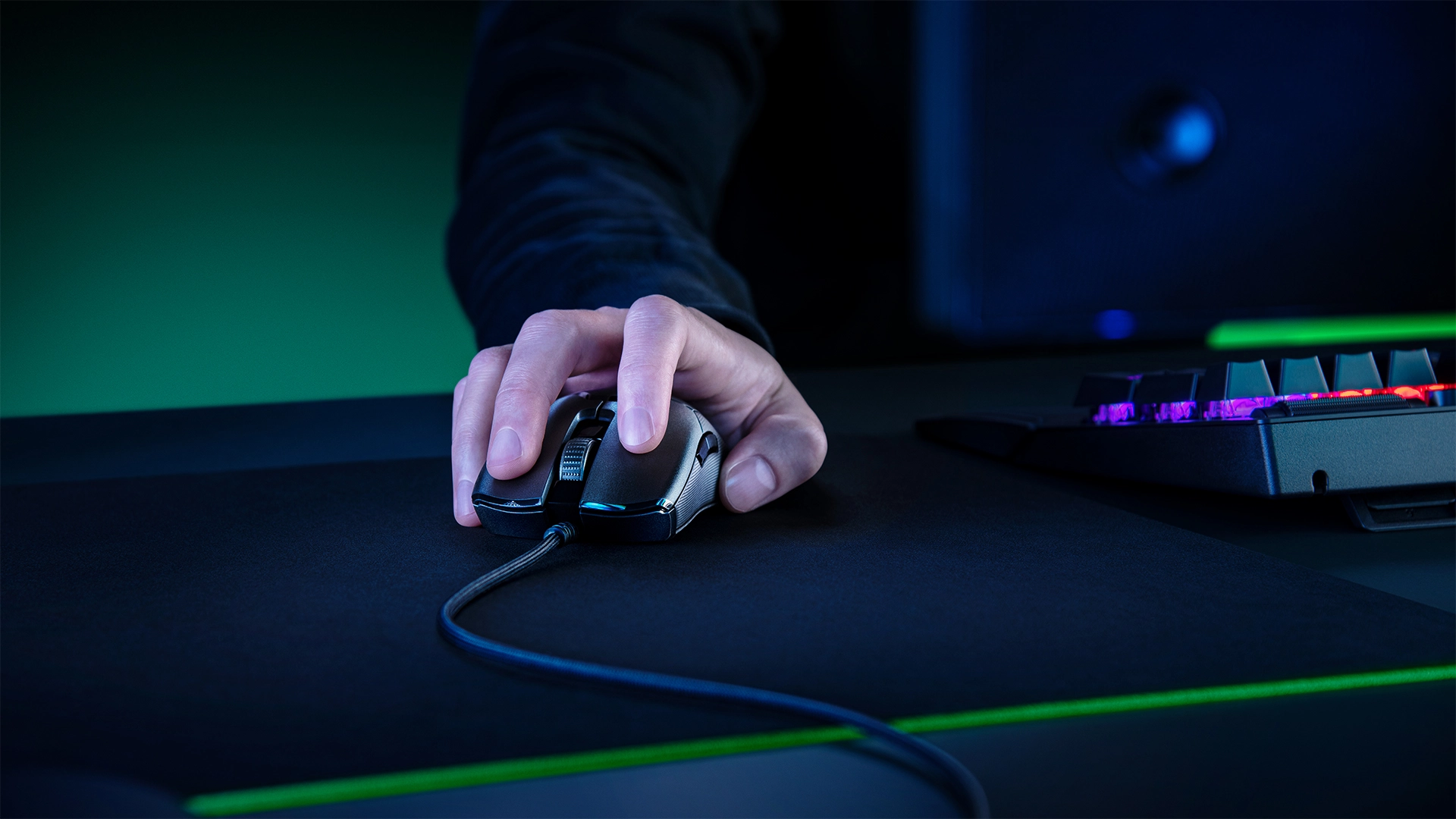 Razer Viper 8K gaming mouse being used on a Razer RGB mousepad