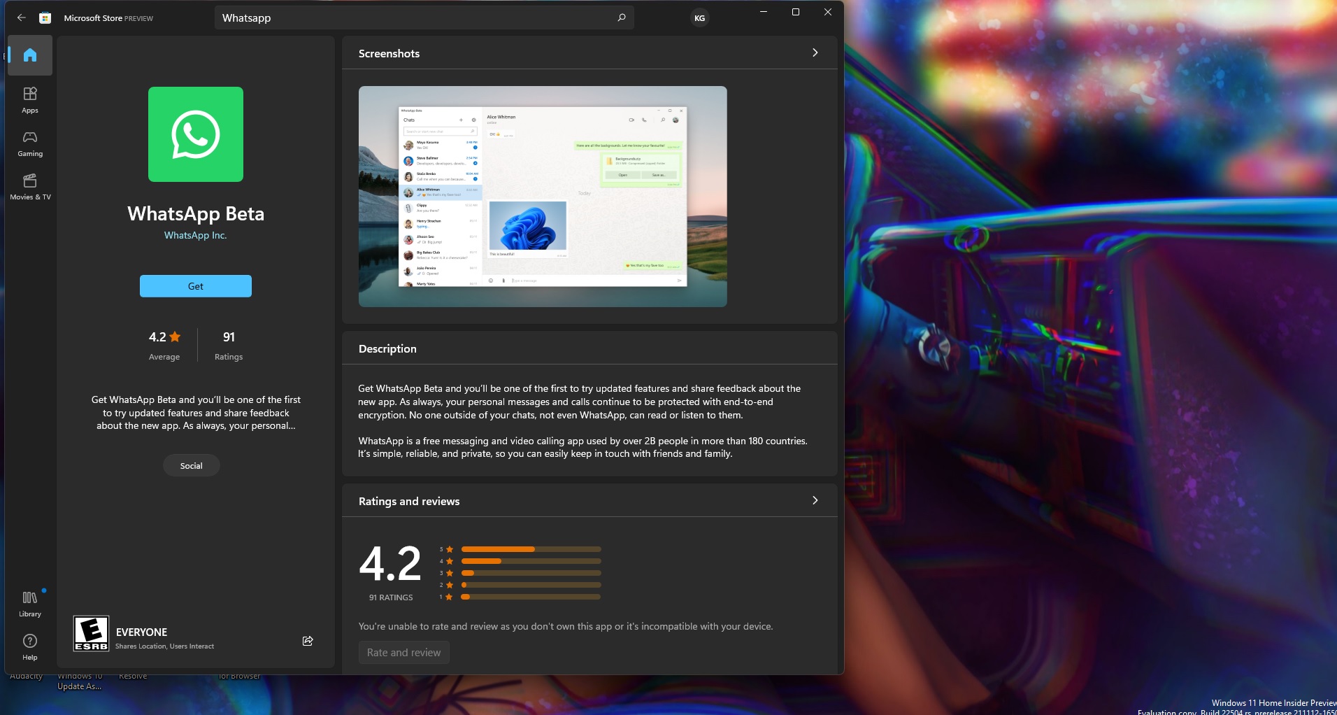 5. A new window titled "Microsoft Store Preview" will appear. Click on "Get" under WhatsApp Beta. This will launch the download, which should only take a few minutes.