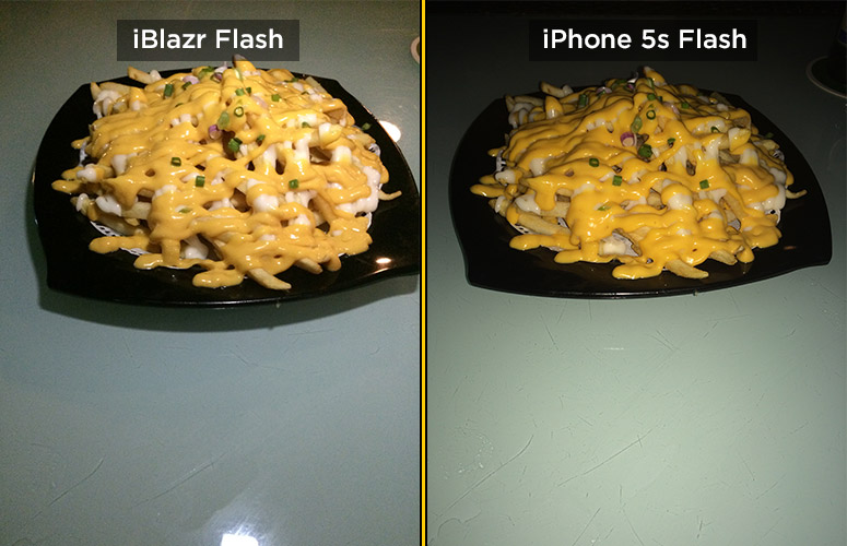 In a close-up shot of a plate of cheesy fries in a dark bar, the iPhone 5s' flash was overpowering, lighting up just the subject but blacking out the back corners of the photo. The same picture taken with the iBlazr was more evenly lit, and we could see more in the background.