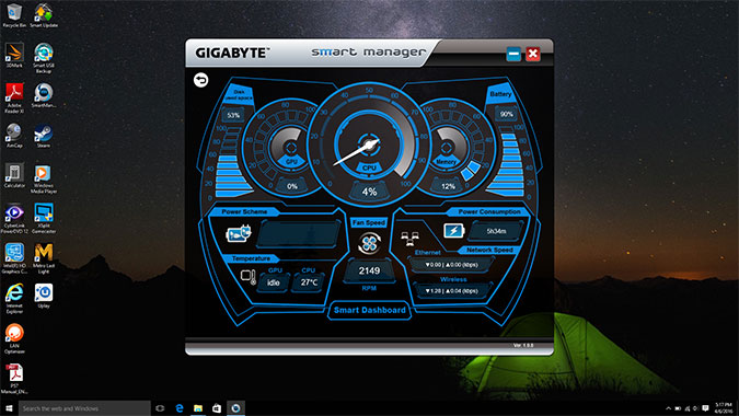 I really like Gigabyte's Smart Manager app, which controls things such as fan speeds, font size and display calibration. And if you hit the Smart Dashboard button, the app launches into a system monitor that makes you feel like you're in the cockpit of a spaceship. From there, you can see updated info on your CPU temp, storage space and memory usage, which are helpful to track when you're trying to eke out every last bit of performance.