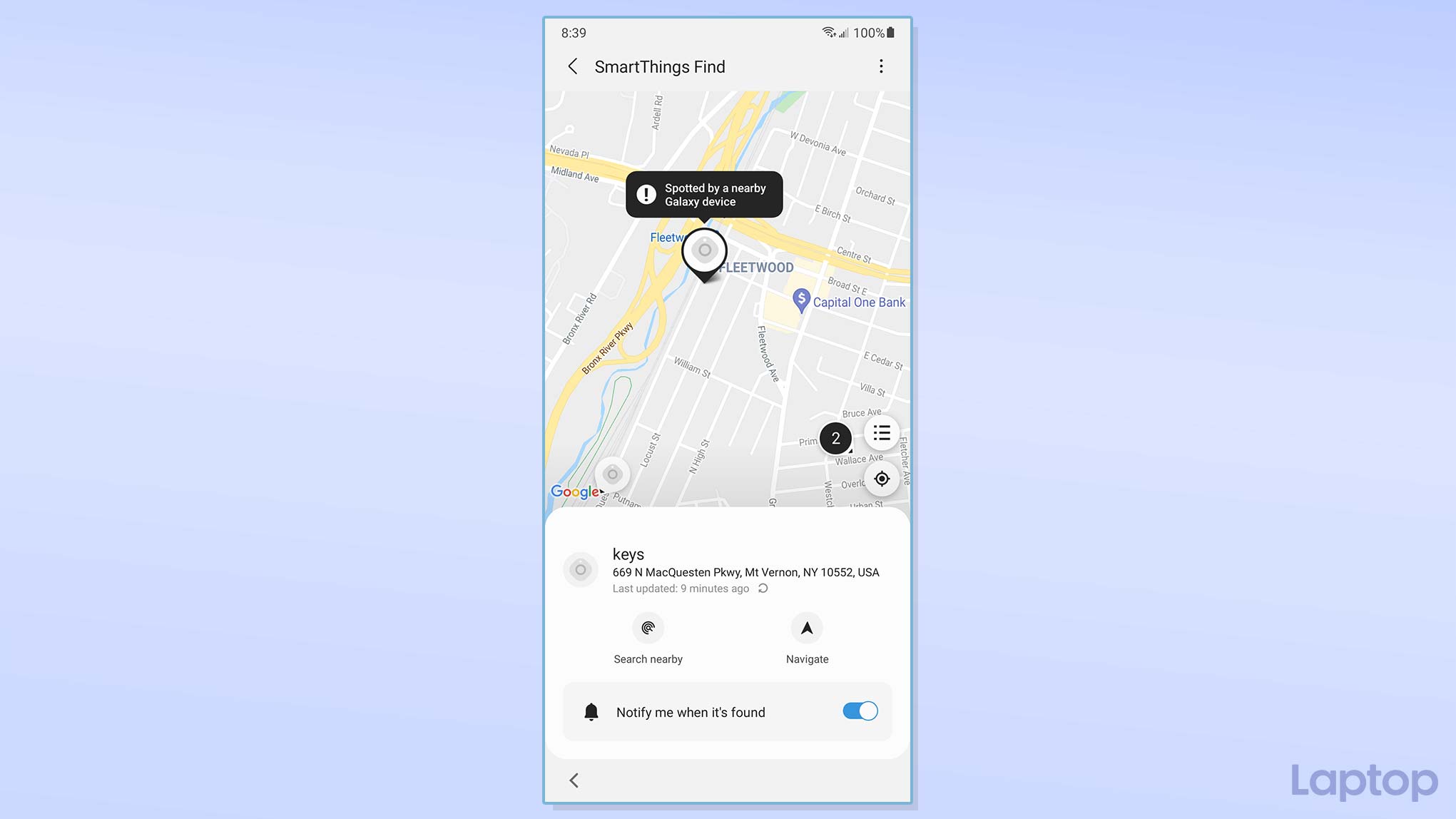 To try it out, I “accidentally” left my tagged keys on a bench at a local train station and watched from afar. Within three minutes, the tag registered on the SmartThings Find’s map as “Spotted by a nearby Galaxy device.” I zoomed in on its exact location and retrieved the tag. If I were farther away, I could have used Google maps to navigate me there.