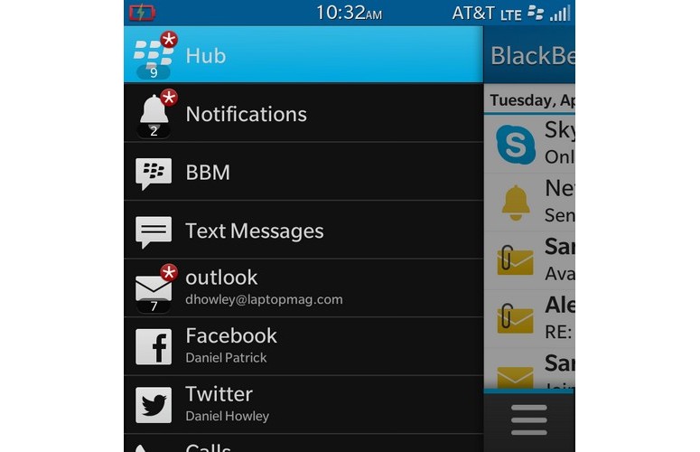 Peek refers to the ability to gesture up from the bottom of the screen, and then to the right, in one motion to see the BlackBerry Hub. The Hub aggregates everything from your email and text messages to Facebook messages and Twitter mentions. (That's why you won't find a dedicated email app.) You can also Peek at the Hub just by swiping from right to left while on the main home screen.