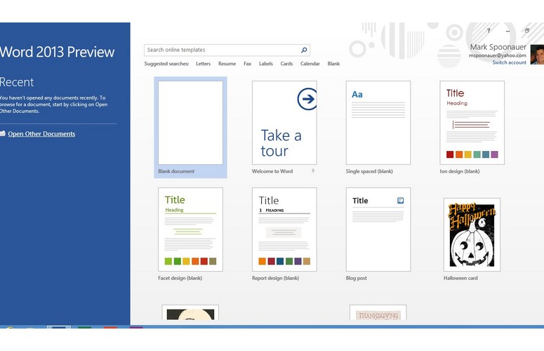 Click to EnlargeAlthough the included version of Office doesn't have Outlook, there is a separate Mail app that lets you add multiple accounts (Exchange, Gmail, Yahoo, etc). If a person is in your address book, you'll see their profile photo. Click on that and you'll be able to access their latest social updates and photos, as well as map their address or send a message on Facebook. This app certainly feels connected, but the tri-panel interface caused some messages to go off the right side of the screen, forcing us to scroll. We're also not happy about the bcc field and attachment options being hidden, even though there's plenty of room for both.