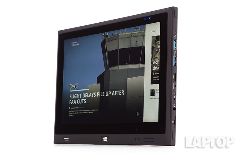 On the top right edge of the X15 is a small power button. All of the tablet's ports line the right side: Two USB 3.0, mini HDMI, a 3.5mm headphone jack and a SIM card slot. Along the bottom edge is the X15's proprietary power port and a vent.